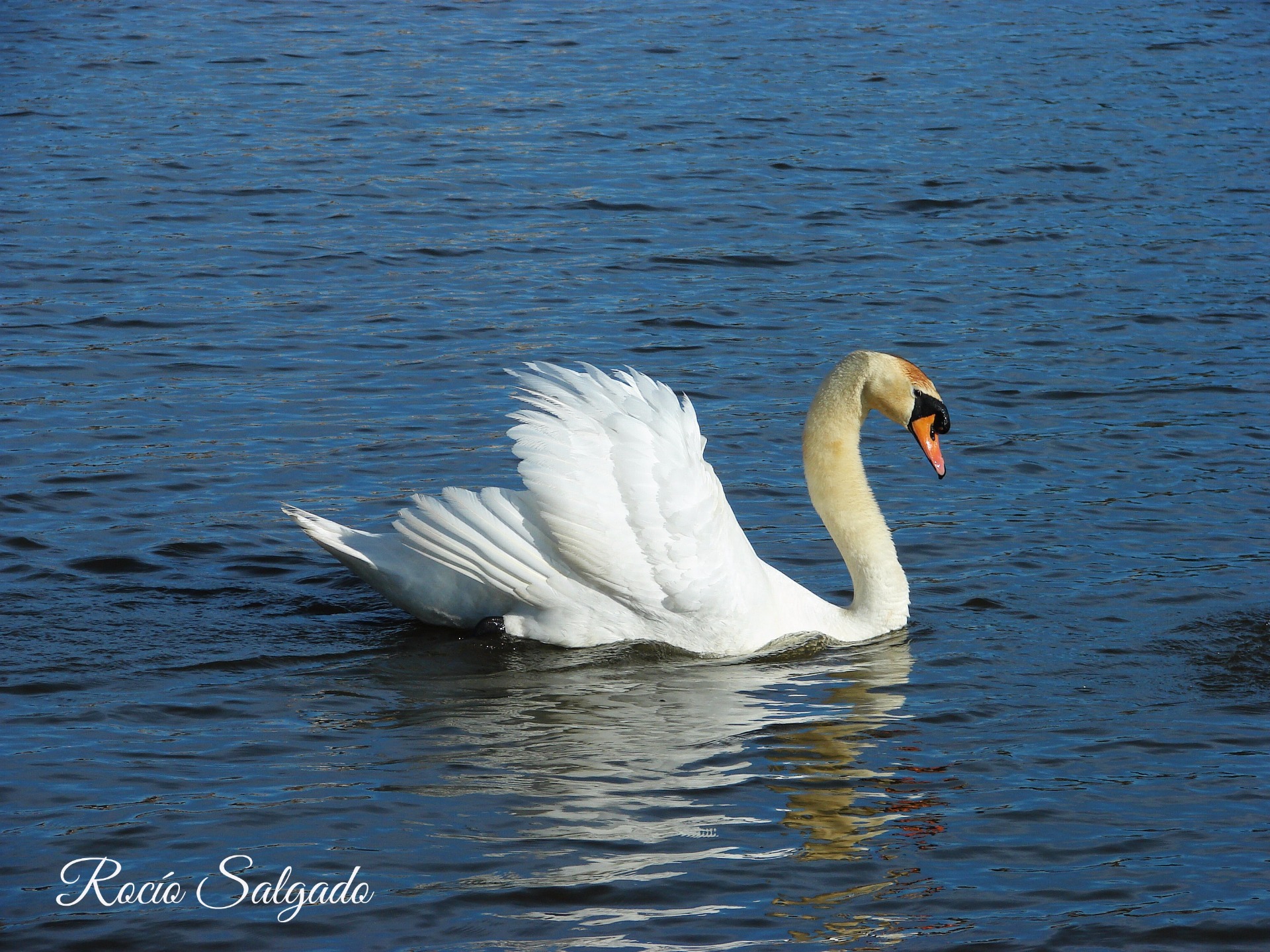 Cisne blanco paseando tranquilamente por las aguas del Guadiana